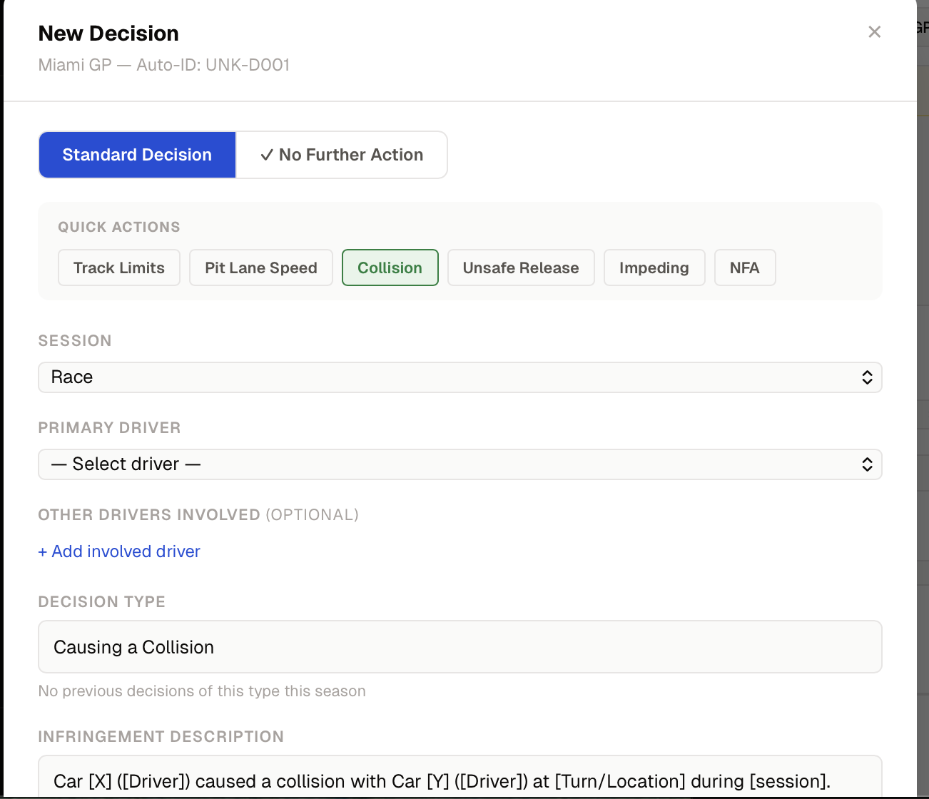 Quick actions for the common infringements: Track Limits, Pit Lane Speed, Collision, Unsafe Release. Selecting Collision starts a draft with the primary driver ready to attach.