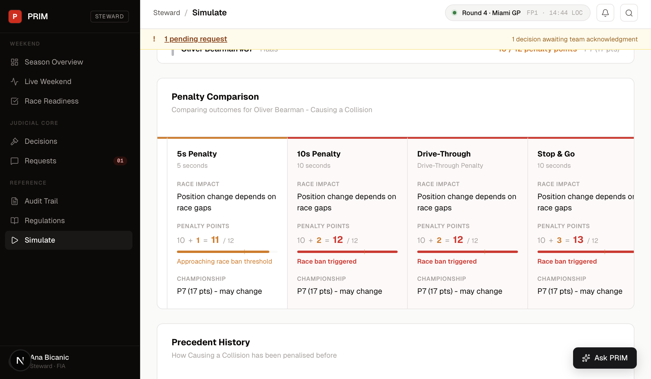 Pick a driver, pick an infringement. PRIM runs every plausible penalty side by side, with race impact, penalty-point math, and race-ban warnings. Nothing gets committed.